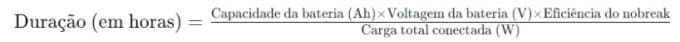 No entanto, para um cálculo preciso, você precisaria das especificações exatas do nobreak, incluindo a capacidade da bateria e a eficiência, bem como a carga total que você pretende conectar ao nobreak.